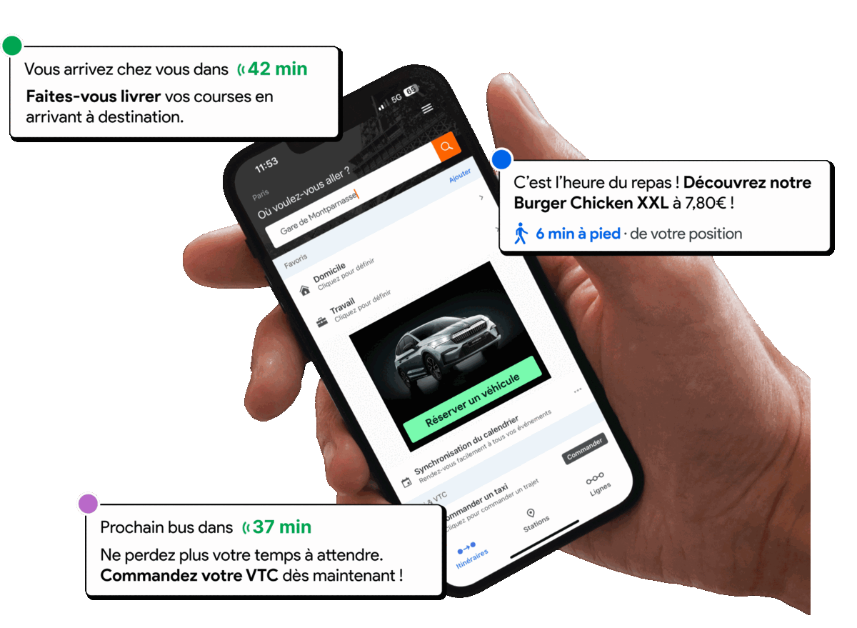 Grâce à une technologie unique de géolocalisation, elle offre une planification de trajets en temps réel pour tous les types de transports en commun (bus, métros, trains, tramways, covoiturage, vélos partagés et trotinettes).